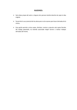 El documento presenta las seis licencias Creative Commons y describe la licencia No Derivadas (CC BY-ND) que el autor utilizaría. La licencia CC BY-ND permite a otros copiar y distribuir el trabajo de forma literal pero no crear obras derivadas. El autor elige esta licencia porque desea mantener la integridad de sus ideas originales y no dar permiso a otros para crear obras derivadas.