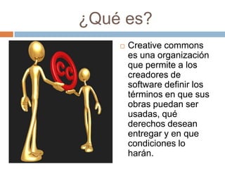 Creative Commons es una organización sin fines de lucro creada por Lawrence Lessig que ofrece licencias para que los creadores puedan definir los términos en que sus obras pueden ser usadas, reservándose algunos derechos. Creative Commons ofrece 6 tipos de licencias que permiten la atribución, distribución y exhibición de obras con diferentes niveles de restricciones sobre el uso comercial y la creación de obras derivadas. Colombia se incorporó a Creative Commons en 2006.