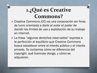 Este documento explica qué son las licencias Creative Commons y sus diferentes tipos. Creative Commons permite a los autores controlar el uso y distribución de su trabajo en internet. Hay seis licencias principales que varían en si permiten usos comerciales, modificaciones o ambos. La licencia Reconocimiento – NoComercial – CompartirIgual (by-nc-sa) es recomendada para un blog personal ya que permite compartir pero no usos comerciales sin autorización.