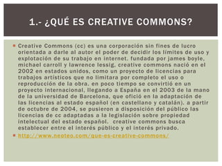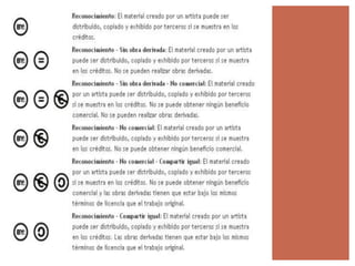 Creative Commons es una organización sin fines de lucro que crea licencias de propiedad intelectual que permiten a los autores compartir sus obras mientras mantienen algunos derechos de autor. Las licencias Creative Commons ofrecen varias opciones para permitir el uso compartido y la creación de obras derivadas, siempre que se reconozca la autoría original.