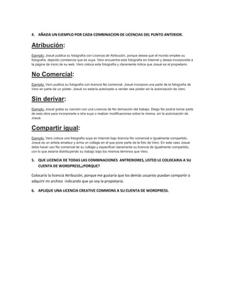 Este documento explica lo que son las licencias Creative Commons, las cuales permiten compartir y usar creaciones de una manera más flexible que el copyright tradicional. Describe las cuatro licencias principales (Atribución, No Comercial, Sin Derivar, Compartir Igual) y sus combinaciones, e ilustra cada combinación con un ejemplo. Finalmente, recomienda aplicar la licencia de Atribución a una cuenta de WordPress para permitir que otros compartan los contenidos mientras acreditan la autoría.