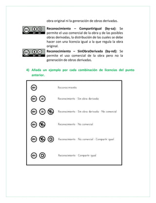 Creative Commons es una organización sin fines de lucro que permite a los autores controlar el uso y distribución de su trabajo a través de varias licencias. Estas licencias incluyen Attribution (BY), que requiere atribución al autor original; Share Alike (SA), que permite obras derivadas bajo la misma licencia; y Non-Commercial (NC), que prohíbe el uso comercial. Existen seis combinaciones de estas licencias que permiten diferentes niveles de modificación y uso comercial de una obra.