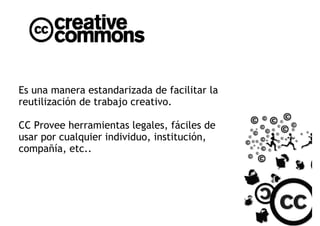 Creative Commons proporciona herramientas legales estandarizadas para facilitar el uso y reutilización de obras creativas bajo diferentes licencias que permiten el uso comercial, la modificación de obras, o ambos. Muchas universidades e instituciones educativas usan licencias Creative Commons para compartir abiertamente sus recursos educativos en línea.