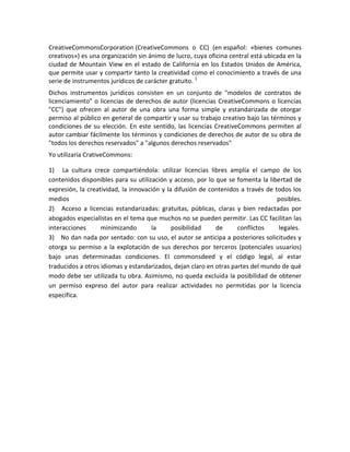 Creative Commons es una organización sin fines de lucro con sede en California que permite compartir y usar la creatividad y el conocimiento a través de licencias de derechos de autor gratuitas. Estas licencias ofrecen al creador de una obra una forma simple y estandarizada de otorgar permiso al público para compartir y usar su trabajo bajo los términos que elija, cambiando los derechos de "todo reservado" a "algunos reservados".