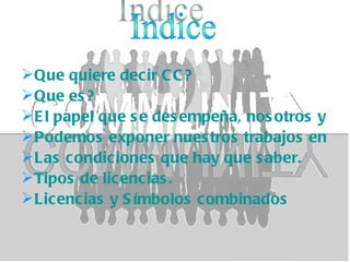 El documento explica las diferentes licencias Creative Commons, cada una con configuraciones diferentes que permiten a los autores decidir cómo compartir su obra en Internet, incluyendo opciones para citar, reproducir, crear obras derivadas o ofrecerla públicamente, con ciertas restricciones como el reconocimiento de la autoría original, prohibir usos comerciales o impedir obras derivadas.