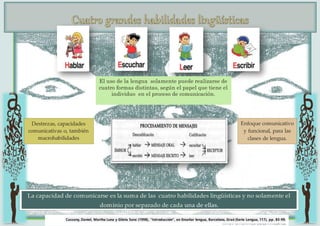 El documento clasifica las cuatro formas en que una persona puede usar el lenguaje en un proceso de comunicación y argumenta que la capacidad de comunicación es la suma de las cuatro habilidades lingüísticas, no el dominio individual de cada una.
