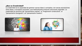 El documento define varios conceptos clave relacionados con el aprendizaje y la cognición humana. Explica que la creatividad es la capacidad de generar nuevas ideas a través de asociaciones originales entre conceptos conocidos. Además, describe el aprendizaje como el proceso de adquirir conocimientos y habilidades a través de la experiencia y la instrucción. Finalmente, introduce brevemente otros conceptos como la memoria, la inteligencia, el lenguaje y el pensamiento, y la motivación.