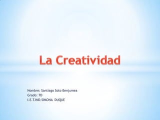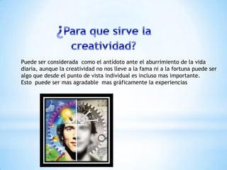 El documento habla sobre la creatividad y su importancia como antídoto contra el aburrimiento de la vida diaria. Define la creatividad como la producción de una idea nueva, original y útil que satisface a su creador. Presenta un proceso creativo que incluye etapas como percibir, pensar, plasmar gráficamente y validar ideas.