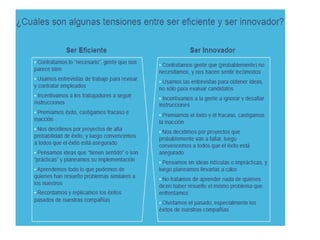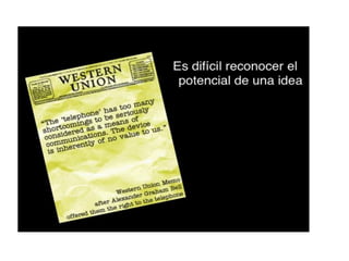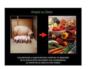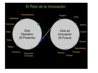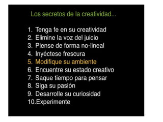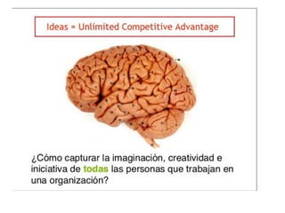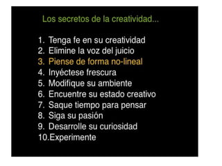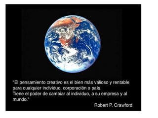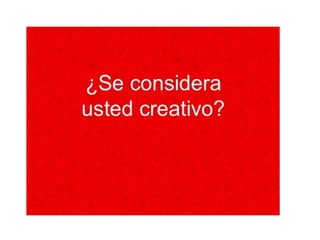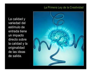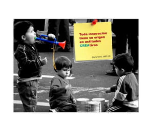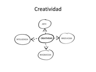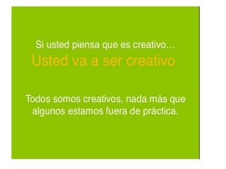El documento trata sobre la creatividad. Explica que la creatividad es la capacidad de expresar la imaginación y sacar ideas de la mente. La innovación toma la creatividad y la aplica para lograr un objetivo específico. Identifica tres componentes de la creatividad: conocimiento, flexibilidad mental y motivación. También incluye varias citas sobre la importancia de mantener la mente abierta y no descartar ideas nuevas.