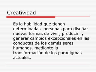 Este documento describe la creatividad, innovación e invención. Explica que la creatividad es la habilidad de diseñar nuevas formas de vivir y producir mediante la transformación de paradigmas. La innovación se refiere a la aplicación de nuevas técnicas o procesos productivos para mejorar algo concreto. La invención es la capacidad de hacer realidad físicamente una idea al superar contradicciones técnicas.