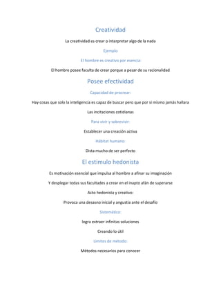 La creatividad humana se refiere a la capacidad de crear e interpretar cosas de forma original a partir de la nada. El hombre es creativo por naturaleza debido a que, a pesar de su racionalidad, posee la habilidad de crear cosas nuevas. La creatividad surge de las motivaciones cotidianas para vivir y sobrevivir, y permite al ser humano establecer creaciones activas para mejorar su hábitat. El impulso hedonista es una motivación esencial que impulsa al hombre a desarrollar su imaginación y habilidades creativ