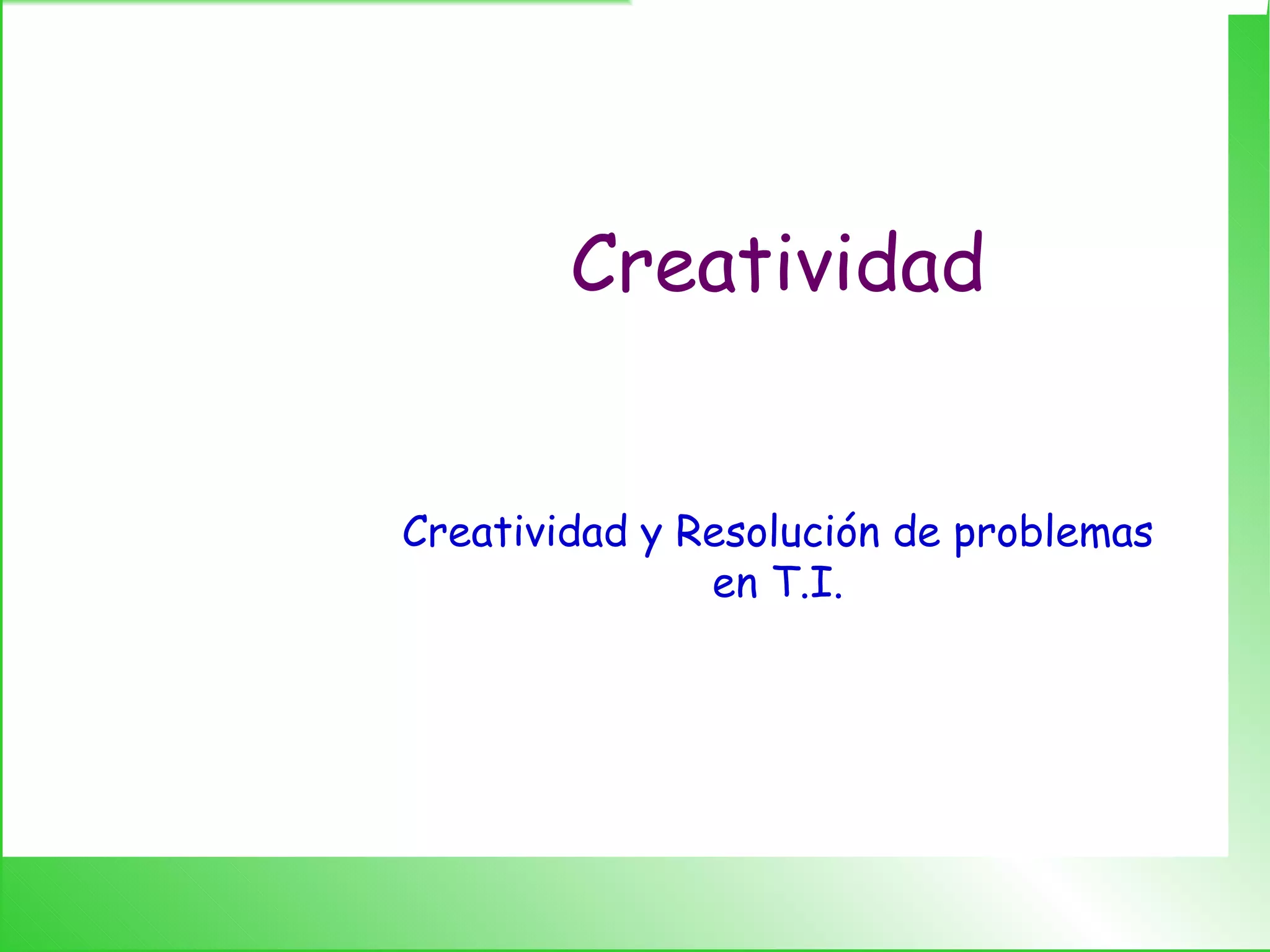 El documento describe la creatividad y el proceso creativo. Explica que la creatividad implica generar nuevas ideas a través de la curiosidad, el pensamiento divergente y el equilibrio entre la imaginación y el análisis. Describe el proceso creativo como tener una fase de preparación, imaginación, desarrollo e implementación de ideas. También identifica factores como la autonomía, los recursos y un clima que premie la innovación como amplificadores de la creatividad en una organización.