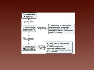 El documento define la creatividad como la generación de nuevas ideas o conceptos mediante la asociación de ideas conocidas de manera original. Explica que la creatividad es más una forma de pensar que una capacidad innata y que implica llevar las ideas a la práctica. Enumera algunas características de la creatividad como la originalidad, fluidez, flexibilidad, sensibilidad y autoestima para generar ideas novedosas y resolver problemas de maneras diversas y determinadas.