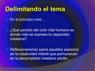 El documento discute los componentes de la personalidad creadora infantil que permanecen en la adultez, incluyendo la curiosidad ilimitada, la experiencia sin miedo ni represión, la originalidad activa, la imaginación y admiración. También argumenta que se debe fomentar la creatividad en la escuela y sociedad en lugar de enfocarse solo en competencias, y concluye invitando a los lectores a completar un lema sobre la creatividad como desafío del presente.