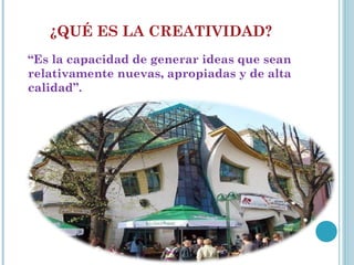 La creatividad se define como la capacidad de generar ideas nuevas y apropiadas. Un producto creativo debe ser original y útil. La creatividad se desarrolla a partir de los conocimientos y experiencias de una persona y es influenciada por la familia, la escuela y el ambiente. La inteligencia, el conocimiento, los estilos de pensamiento, la personalidad y la motivación juegan un papel importante en la creatividad de una persona. Los docentes deben fomentar la curiosidad, la originalidad y la colaboración entre estudiantes para desarrollar su