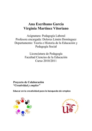 Este documento presenta un proyecto de colaboración en la asignatura de Pedagogía Laboral de la Universidad de Sevilla cuyo objetivo principal es implementar una metodología participativa y activa para educar en la creatividad y el acceso al mercado laboral. El proyecto se desarrollará durante el curso 2010/2011 con estudiantes de la Licenciatura de Pedagogía y abordará conceptos como la formación laboral, nuevas oportunidades de empleo y técnicas para la búsqueda de trabajo.