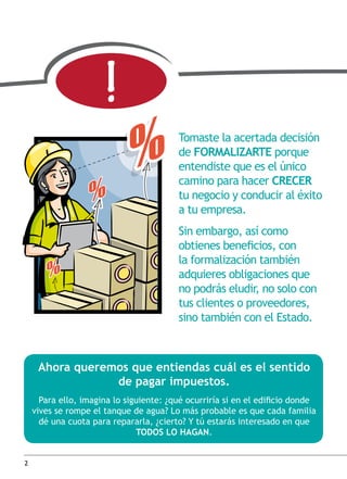 Este documento explica los diferentes regímenes tributarios para empresas en Perú y cómo inscribirse en el Registro Único de Contribuyentes (RUC). Detalla los requisitos, obligaciones y procesos para acogerse al Nuevo Régimen Único Simplificado, el Régimen Especial del Impuesto a la Renta o el Régimen General del Impuesto a la Renta. Además, brinda información sobre los impuestos a la Renta, General a las Ventas e Impuesto de Promoción Municipal. Finalmente, indica que una vez elegido