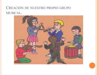Este documento describe una actividad didáctica para crear un grupo musical en el aula. Los objetivos son reconocer instrumentos musicales, trabajar en grupo y mejorar la confianza. Los estudiantes fabricarán sus propios instrumentos usando materiales como cartulina y pegamento. Ensayarán canciones sencillas y darán un concierto final en clase.