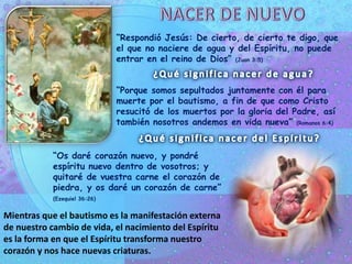 El documento habla sobre el nuevo nacimiento espiritual a través del Espíritu Santo y el bautismo. Explica que el nuevo nacimiento conlleva una nueva vida y un corazón transformado, aunque el proceso de crecimiento espiritual es gradual. También destaca la importancia de permanecer en Cristo a través del estudio bíblico y la oración, así como llevar diariamente la cruz de negarnos a nosotros mismos para recibir fuerza y crecer en él.