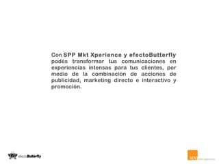 El documento describe varias campañas y activaciones realizadas por SPP Mkt Xperience y efectoButterfly para diferentes clientes. Incluye información sobre campañas de Coca-Cola, Telecom, Fiat, Fox Sports, Reader's Digest y otros clientes, que involucraron actividades como stands, eventos, lanzamientos de productos, y campañas de marketing directo y digital.