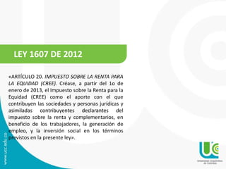 La ley 1607 de 2012 creó el Impuesto sobre la Renta para la Equidad (CREE) para que las empresas y personas jurídicas contribuyan a beneficiar a los trabajadores, generar empleo e invertir en programas sociales. Los recursos del CREE se destinarán al Servicio Nacional de Aprendizaje (SENA) e Instituto Colombiano de Bienestar Familiar (ICBF). Además, la ley exonera del pago de aportes parafiscales a empresas y personas naturales por trabajadores que devenguen hasta 10 salarios mínimos