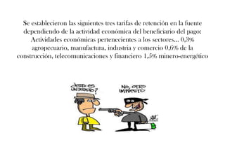 El Congreso creó el impuesto CREE para garantizar la sostenibilidad financiera del SENA y el ICBF. A diferencia de la nómina, el CREE grava las utilidades de las empresas en lugar de los salarios, desplazando la carga tributaria de sectores como la industria y la agricultura hacia sectores más rentables como la minería y las finanzas. El CREE establece tres tarifas de retención en la fuente del 0.3%, 0.6% y 1.5% para diferentes actividades económicas.