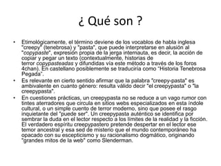 Este documento describe cuatro creepypastas populares: Jeff the Killer, Jason Vorhees, Slenderman y Herobrine. Un creepypasta es una historia de terror que se difunde por internet. Jeff the Killer es un asesino que ataca a una joven en su casa. Jason Vorhees es el asesino de la serie de películas Viernes 13. Slenderman es un ser pálido y delgado con tentáculos que secuestra a sus víctimas. Herobrine es un personaje misterioso que aparece en el juego Minecraft asustando a los jugadores