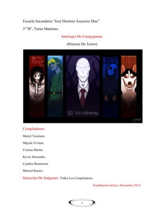 La antología de creepypastas compilada por estudiantes de la escuela secundaria 'José Dionisio Ascencio Díaz' presenta historias de terror populares de internet, detallando experiencias sobrenaturales y encuentros con seres misteriosos como Slender Man y Jeff the Killer. Estas narraciones han sido seleccionadas para provocar terror y suspenso, advirtiendo que no son aptas para todos los públicos debido a su contenido inquietante. El documento incluye definiciones de creepypastas y una variedad de relatos que abarcan desde anécdotas hasta episodios perdidos de programas infantiles, fomentando la curiosidad por lo inexplicable.