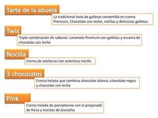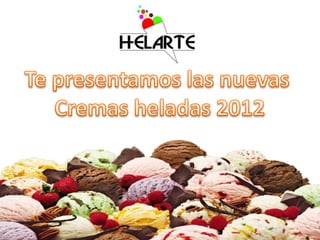 Este documento presenta una lista de nuevas cremas heladas que se han añadido al catálogo para la temporada 2012, incluyendo cremas de galletas con caramelo y chocolate, avellanas con nocilla, chocolate blanco, negro y con leche, pannetonne con fresa y bizcocho, cacao intenso, cereza con chocolate, regaliz con piña, mango con piña, flan con caramelo, naranja con trocitos de chocolate y una crema de sabor a nube.