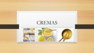 Este documento describe diferentes tipos de cremas. Explica cremas básicas como la crema inglesa o salsa inglesa, la crema pastelera, la crema Chantilly y la crema de mantequilla. También describe el lemon curd, una crema hecha con zumo de limón en lugar de leche. Finalmente, menciona algunas cremas derivadas como la crema pastelera, la crema chiboust y la crema muselina.