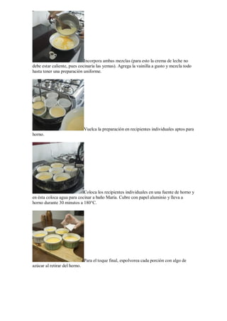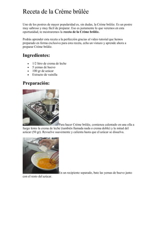 La receta explica cómo hacer crème brûlée, un popular postre francés. Se prepara calentando crema de leche y azúcar hasta disolver, luego se mezcla con yemas de huevo y vainilla. La mezcla se vierte en recipientes y se hornea a baño maría. Finalmente, se espolvorea azúcar en la superficie y se quema con una hornalla para formar la característica costra crujiente. El documento también incluye un enlace a un video tutorial para aprender a preparar el plato.