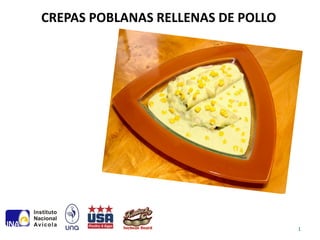Este documento proporciona una receta para crepas poblanas rellenas de pollo. La receta incluye instrucciones detalladas para preparar la salsa poblana y el relleno de pollo, así como instrucciones para armar las crepas rellenas. También incluye una tabla nutricional y un costeo de los ingredientes.