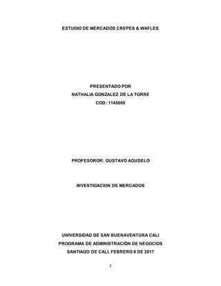 El documento presenta un estudio de mercado de la cadena de restaurantes Crepes & Waffles, centrándose en su comportamiento empresarial, características de consumidores y competencia en el sector de helados. Se detalla la trayectoria de la empresa desde su fundación en 1980, su expansión internacional, y la calidad de sus productos que han llevado a un crecimiento notable en Colombia. Además, aborda estrategias de marketing y el análisis de sus fortalezas y debilidades en el mercado actual.