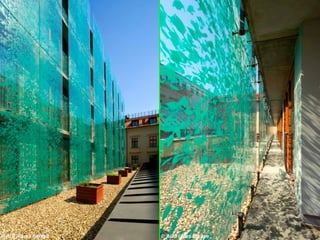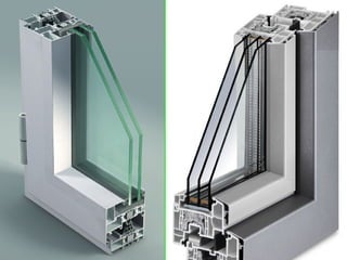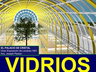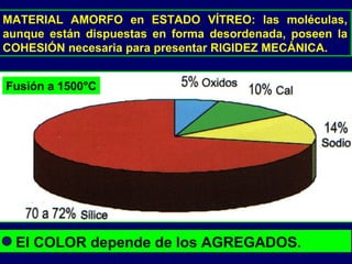 El documento describe diferentes tipos de vidrios, sus propiedades y usos. Explica que el vidrio es un material amorfo frágil pero rígido compuesto de moléculas unidas por enlaces débiles. Luego detalla varios procesos como el flotado y templado que mejoran sus propiedades mecánicas y de seguridad. También cubre vidrios laminados, impresos, translúcidos y de alto rendimiento con recubrimientos para control solar.