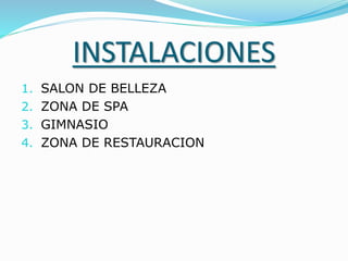 El documento presenta un proyecto escolar para crear un centro de belleza y spa que incluiría un salón de belleza, zona de spa con sala de masajes, baño turco y sauna, gimnasio y zona de restauración. Detalla las instalaciones, factores de producción, aspectos económicos como la financiación, difusión a través de una página web y aplicación móvil, y perspectivas de futuro del proyecto.
