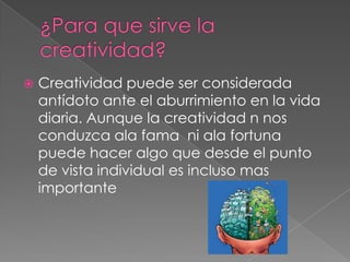 La creatividad puede ser un antídoto contra el aburrimiento y aunque no necesariamente conduce a la fama o la fortuna, puede hacer algo más importante como individuo. La creatividad se define como la producción de una idea u concepto nuevo y original que satisface tanto al creador como a los demás. La creatividad consiste en la capacidad de ver las cosas más allá de lo que ven nuestros ojos.