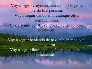 Este documento expresa la determinación de continuar creyendo en la esperanza, el amor y la paz a pesar de la desesperanza, el odio y la guerra que otros puedan sembrar. Afirma que siempre habrá razones para mantener la fe en la humanidad, como los niños y la naturaleza, y que un gesto de cariño puede ayudar a superar los momentos más difíciles.