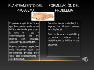 Este documento presenta un proyecto para la crianza y engorde de búfalos en Colombia. El proyecto busca aumentar la producción y comercialización de búfalos y sus productos en el país, dado que actualmente son poco conocidos y su oferta es limitada. El estudio de mercado muestra una alta demanda insatisfecha para la carne, leche y cueros de búfalo. El proyecto propone establecer un criadero de 10 hectáreas en Casanare para la reproducción y venta de búfalos, y describe los requer