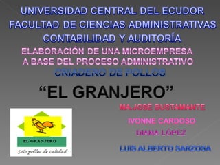 El documento presenta un proyecto de crianza de pollos de engorde llamado "Criadero de Pollos El Granjero" en Ecuador. El proyecto busca aprovechar el crecimiento poblacional alrededor del nuevo aeropuerto de Quito para ofrecer productos avícolas de calidad a clientes nacionales y extranjeros. Se describen los objetivos, misión, visión e instalaciones del proyecto, así como su organización, producto, mercadeo y viabilidad financiera.