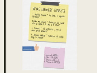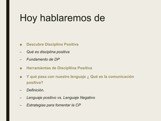 Este documento presenta los principios y herramientas de la disciplina positiva. Explica que se basa en el respeto del niño y en enseñar habilidades para la vida sin perder la firmeza. Describe las aportaciones de Adler y Dreikurs sobre la importancia de la pertenencia, la comunicación efectiva y las metas de la conducta. Además, detalla herramientas como el tiempo fuera positivo, preguntas de curiosidad y enfoque en soluciones, así como la importancia de una comunicación positiva basada en un lenguaje que
