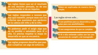 El documento aborda la importancia de la crianza respetuosa y la necesidad de establecer límites saludables para el desarrollo emocional de los niños preescolares. Se destaca que los límites enseñan a los niños a respetar normas y a desarrollar autocontrol, empatía y responsabilidad. Además, enfatiza la relevancia de una relación cálida y confiable entre adultos y niños para facilitar este proceso.