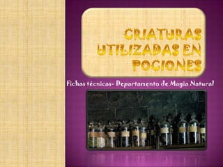 Este documento proporciona información sobre varias criaturas utilizadas en pociones, incluyendo acromántulas, murtlaps, y diferentes razas de dragones. Describe sus características físicas, hábitats naturales, comportamientos de reproducción y alimentación, así como los ingredientes derivados de cada criatura que se usan comúnmente en pociones.