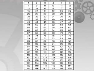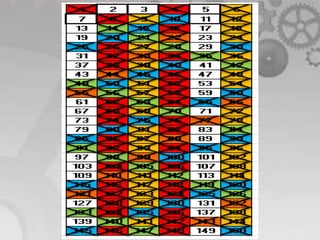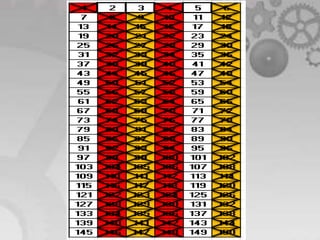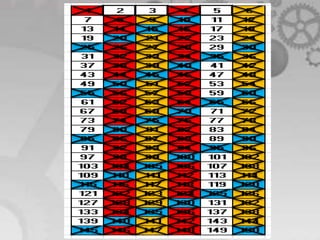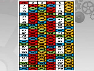 El documento describe el método de Erastótenes para determinar números primos, el cual implica escribir números del 1 al 150, seleccionar el primer número primo (2) y eliminar sus múltiplos, luego seleccionar el siguiente número primo (3) y eliminar sus múltiplos, repitiendo este proceso para encontrar todos los números primos restantes.