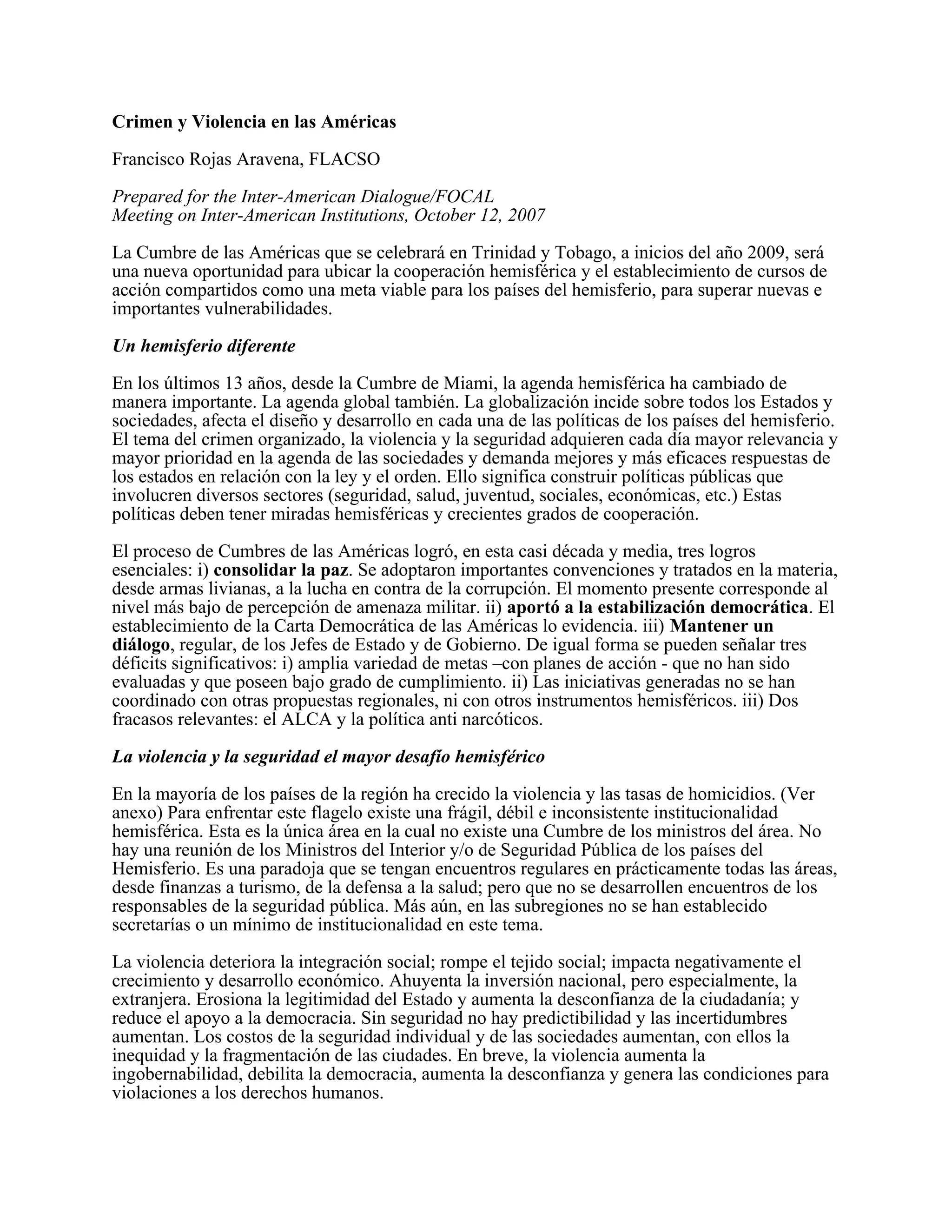 Este documento discute el tema de la violencia y la seguridad en las Américas. Señala que la violencia y las tasas de homicidio han crecido en la mayoría de los países de la región. Argumenta que se necesita una mayor cooperación e institucionalidad hemisférica para abordar este problema, incluyendo un foro permanente para los responsables de seguridad pública y un grupo de trabajo para revisar convenciones de la ONU. También propone diseñar una estrategia global para enfrentar el crimen organizado transnacional y establecer polí
