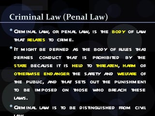 El documento proporciona una introducción al derecho penal y la criminología. Explica que el derecho penal se refiere a las leyes relacionadas con el crimen y establece el castigo para aquellos que violan la ley. La criminología es el estudio científico de la conducta criminal y los factores que la influyen. Algunas áreas de estudio incluyen tipos de crímenes, víctimas, consecuencias del crimen y la victimización. El documento también describe brevemente los objetivos del derecho penal y las consecuencias