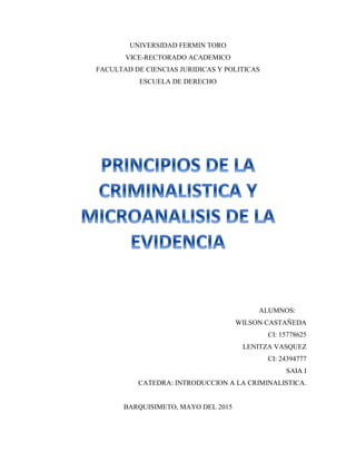 Este documento describe 7 principios fundamentales de la criminalística que pueden llevar al esclarecimiento de un hecho delictivo. Estos principios son: uso, producción, intercambio, correspondencia, reconstrucción de hechos, probabilidad y certeza. También explica el microanálisis de evidencia, el cual somete muestras pequeñas a análisis científicos para obtener resultados que ayuden a esclarecer un crimen. Finalmente, señala que los laboratorios de criminalística aplican ciencias como qu