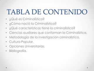 Este documento presenta una introducción a la criminalística. Explica que la criminalística es la aplicación sistemática de la ciencia para investigar crímenes y procesos judiciales. Se desarrolló a partir de investigaciones policiales empíricas y recibió su nombre del Dr. Hanns Gross. Se compone de ciencias forenses como la balística, dactiloscopía y antropología forense. Siguiendo un método, analiza escenas del crimen para esclarecer los hechos mediante técnicas como las encontradas en