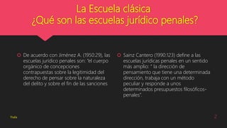 Este documento resume los principales conceptos y exponentes de la Escuela Clásica del Derecho Penal. Explica que la Escuela Clásica se basa en el Derecho Natural y enfatiza principios como el libre albedrío y la legalidad. Menciona a Cesare Beccaria, Pellegrino Rossi, Giovanni Carmignani y Francisco Carrara como sus representantes más importantes. Finalmente, resume los postulados fundamentales de la Escuela Clásica, como que la pena es una retribución proporcional al delito y que el objetivo es restablecer el