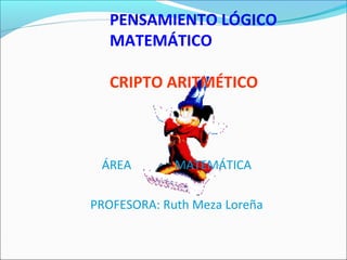 Este documento presenta información sobre criptoaritmética y pensamiento lógico matemático. Propone varios ejercicios criptoaritméticos para que los estudiantes resuelvan, como expresar el número 100 usando 5 números y operaciones, y determinar valores desconocidos en sumas y multiplicaciones. También incluye preguntas sobre metacognición para que los estudiantes reflexionen sobre su aprendizaje y la importancia de empezar con ejemplos concretos antes de conceptualizar un tema.