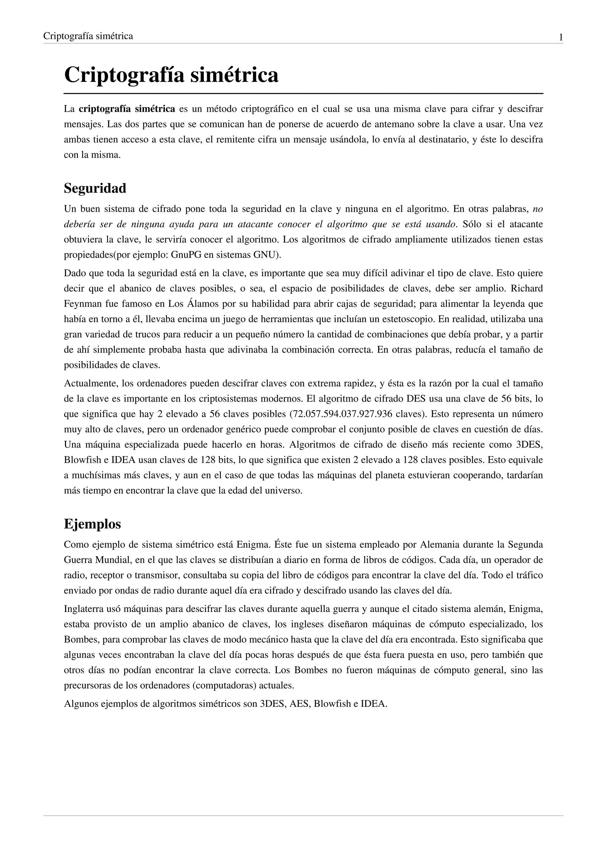 La criptografía simétrica utiliza la misma clave para cifrar y descifrar mensajes. La seguridad depende completamente de mantener en secreto la clave compartida entre las partes. Aunque es segura, tiene inconvenientes para el intercambio de claves y escalabilidad a grupos grandes, lo que ha llevado al desarrollo de criptografía asimétrica e híbrida.
